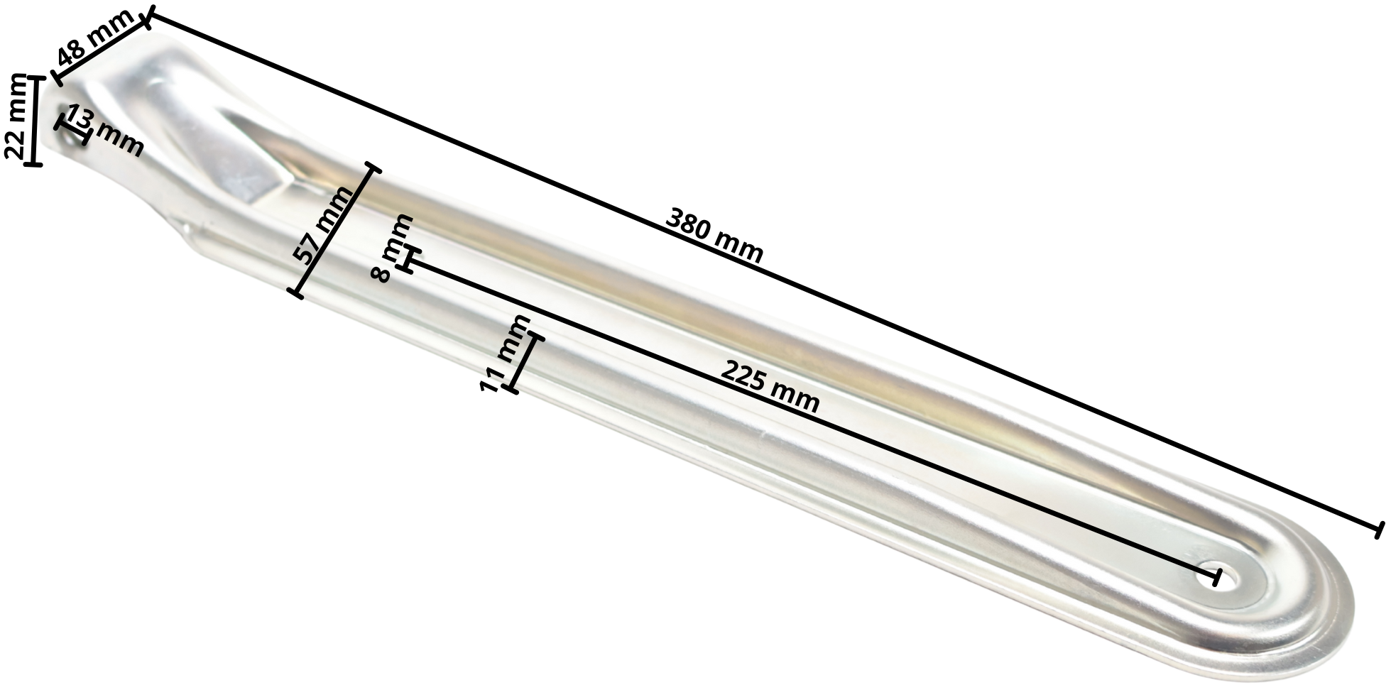 Deze klepscharnier heeft een totale lengte van 385 mm, de breedte is 56 mm en het gat is 17 mm. Deze achterbord scharnier kan gecombineerd worden met een opschroefbare scharnierhouder of lasduim. Deze twee producten zijn hieronder eenvoudig bij te bestellen.
