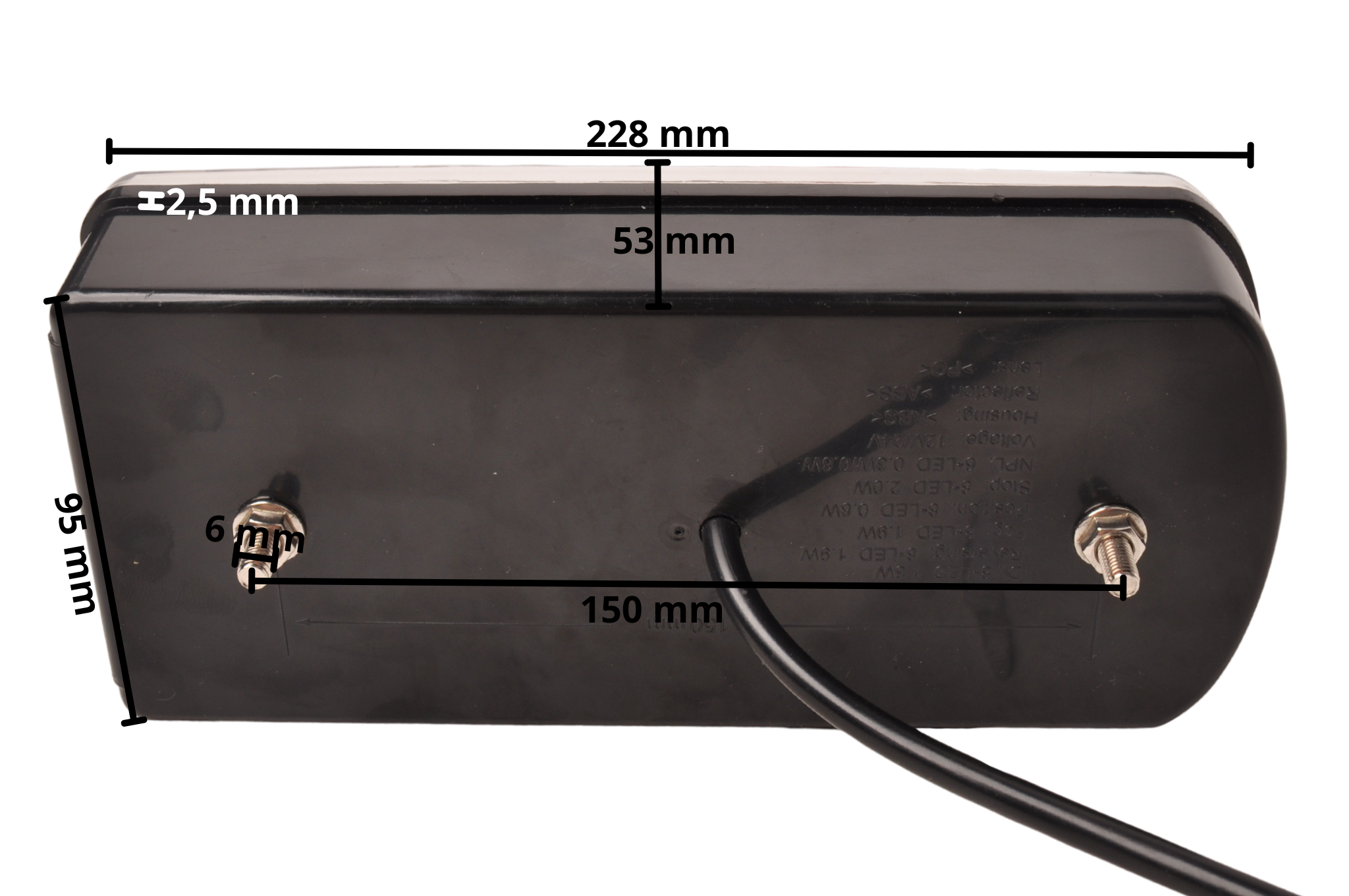 Deze LED lamp heeft de afmetingen van 228x100x53 mm. Deze lamp beschikt over alle beschikbare functies van een linker achterlicht.