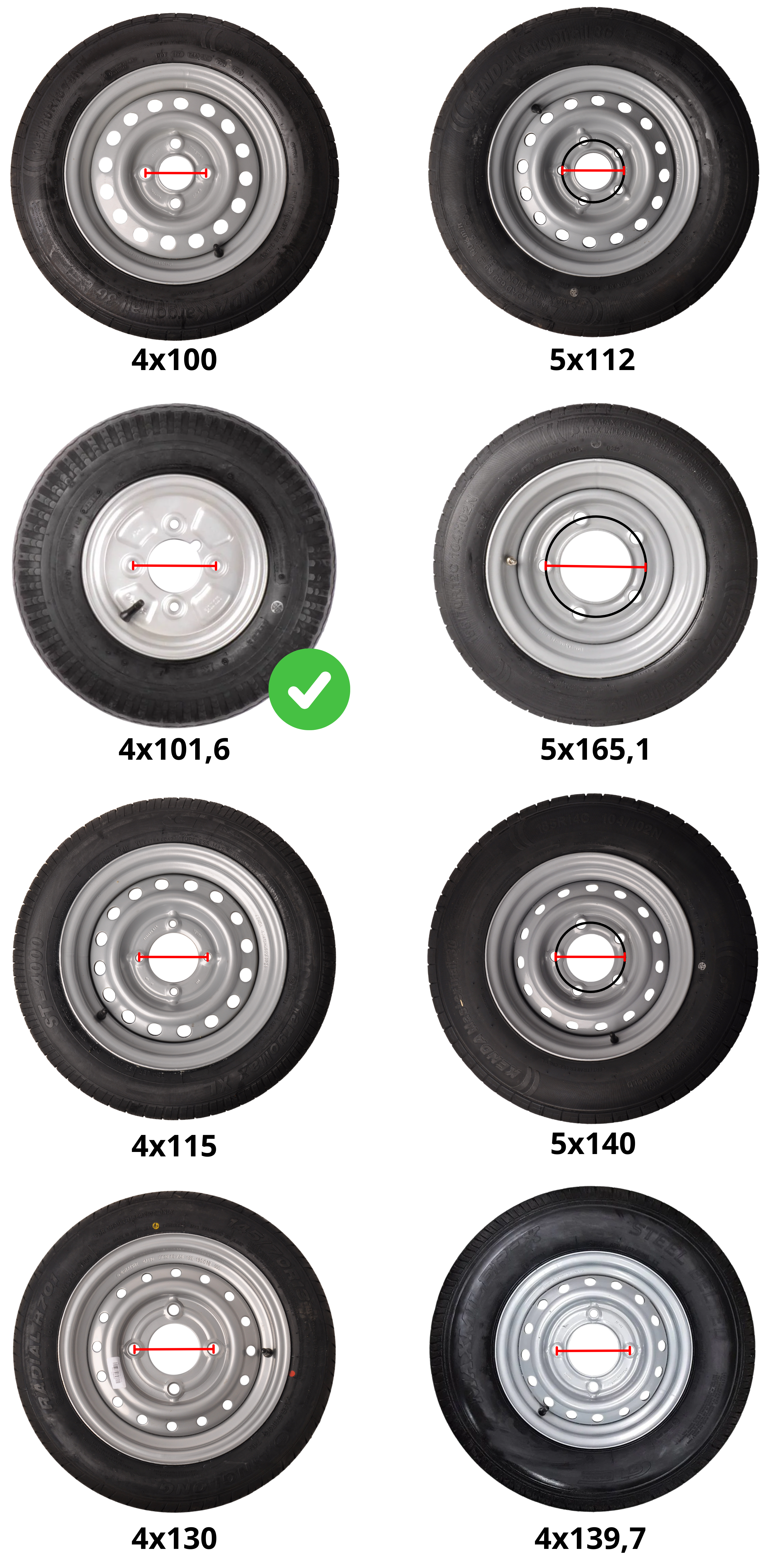 Om te weten of de velg van de aanhanger ook op de as past is het van belang om de steekmaat te weten. De steekmaat is de afstand tussen de boutgaten van de velg. De steekmaat wordt weergegeven in het aantal boutgaten en de afstand van de boutgaten. Bij 4 en 6 gats velgen is dit makkelijk te meten omdat de gaten recht tegenover elkaar staan. Bij 5 gats velgen is dit iets lastiger. In de afbeelding zie je dat er vanuit het hart van een boutgat een denkbeeldige cirkel getrokken moet worden om de juiste afmeting te bepalen.