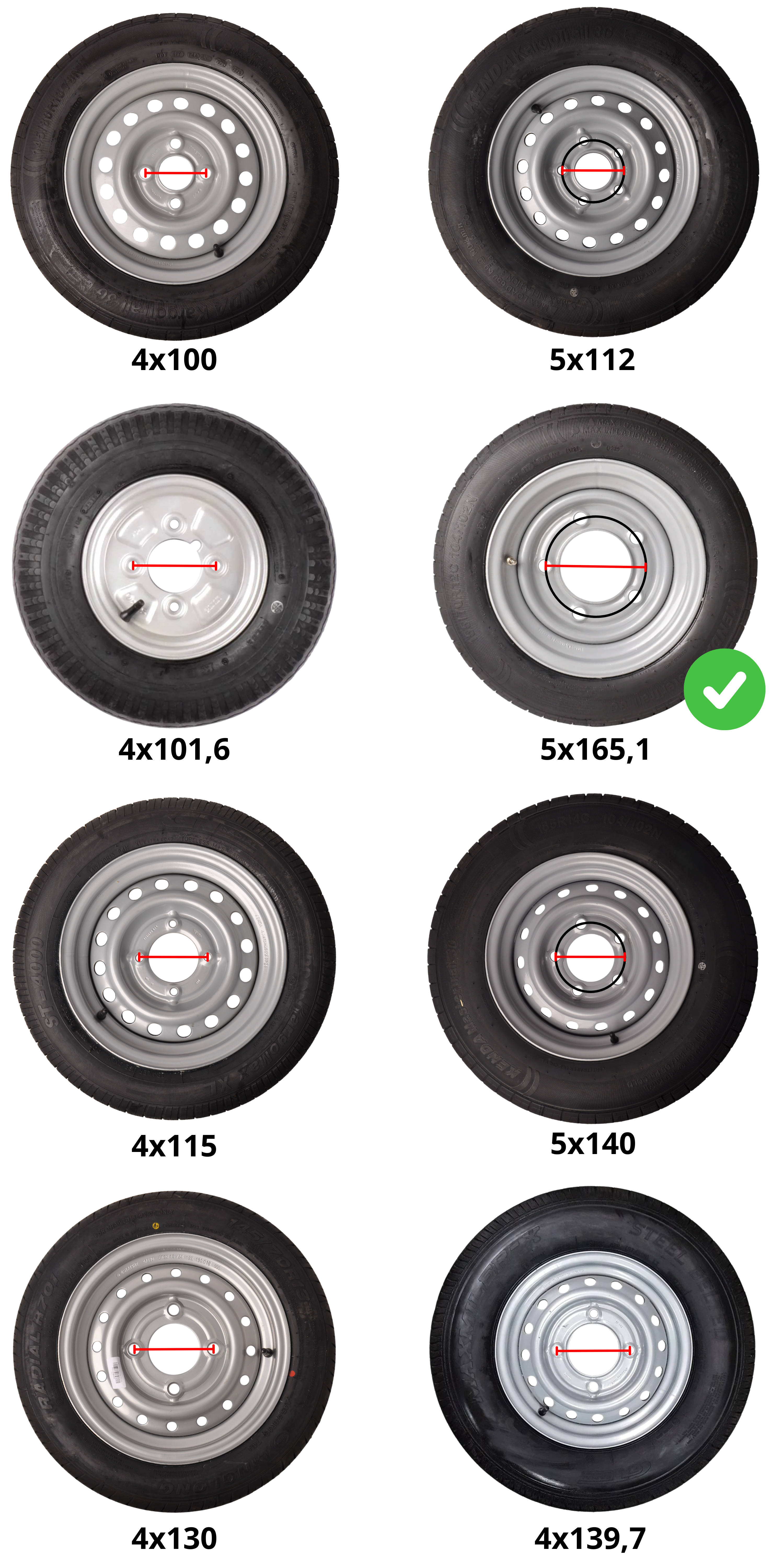 Om te weten of de velg van de aanhanger ook op de as past is het van belang om de steekmaat te weten. De steekmaat is de afstand tussen de boutgaten van de velg. De steekmaat wordt weergegeven in het aantal boutgaten en de afstand van de boutgaten. Bij 4 en 6 gats velgen is dit makkelijk te meten omdat de gaten recht tegenover elkaar staan. Bij 5 gats velgen is dit iets lastiger. In de afbeelding zie je dat er vanuit het hart van een boutgat een denkbeeldige cirkel getrokken moet worden om de juiste afmeting te bepalen.