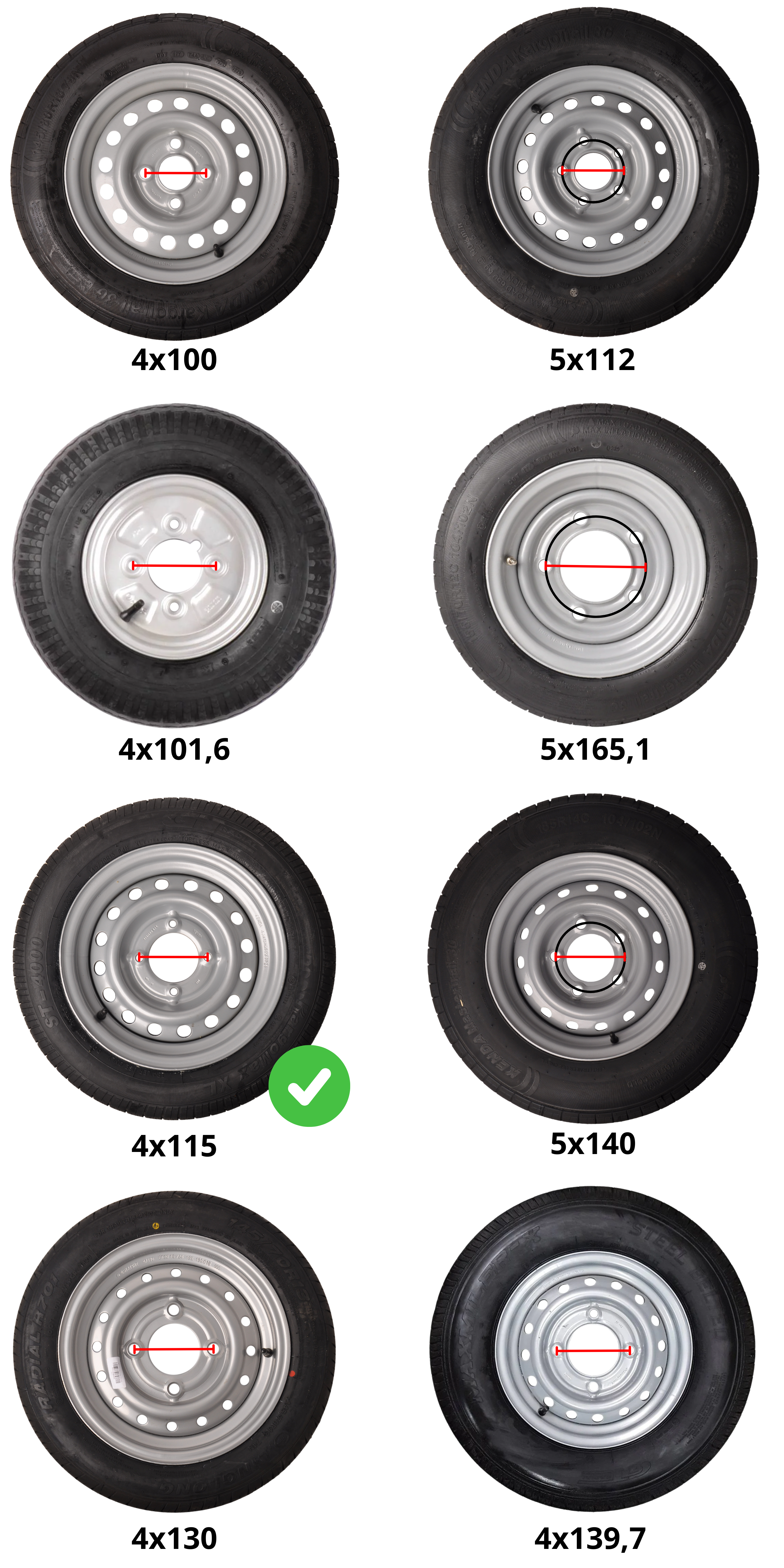 Om te weten of de velg van de aanhanger ook op de as past is het van belang om de steekmaat te weten. De steekmaat is de afstand tussen de boutgaten van de velg. De steekmaat wordt weergegeven in het aantal boutgaten en de afstand van de boutgaten. Bij 4 en 6 gats velgen is dit makkelijk te meten omdat de gaten recht tegenover elkaar staan. Bij 5 gats velgen is dit iets lastiger. In de afbeelding zie je dat er vanuit het hart van een boutgat een denkbeeldige cirkel getrokken moet worden om de juiste afmeting te bepalen.