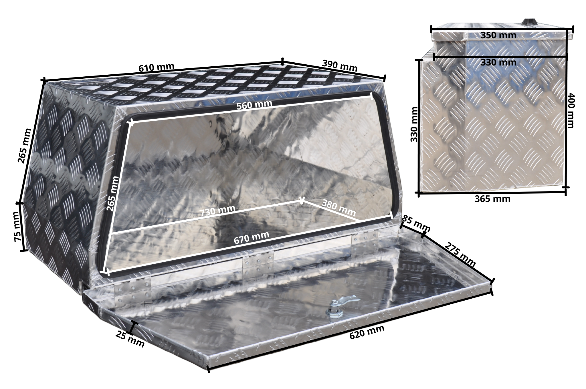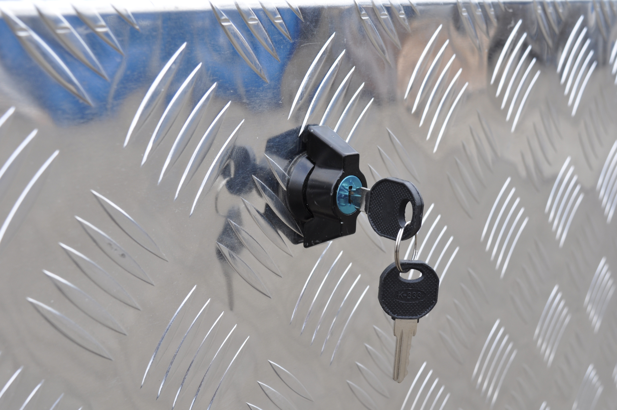 Het geïntegreerde slot zorgt ervoor dat je je spullen altijd en overal veilig kunt opbergen. De hoogwaardige aluminium constructie (2,5 mm dik) met schuine zijden en een terugliggende deksel voorkomt dat de klep tegen de zijwand van de trailer opent.