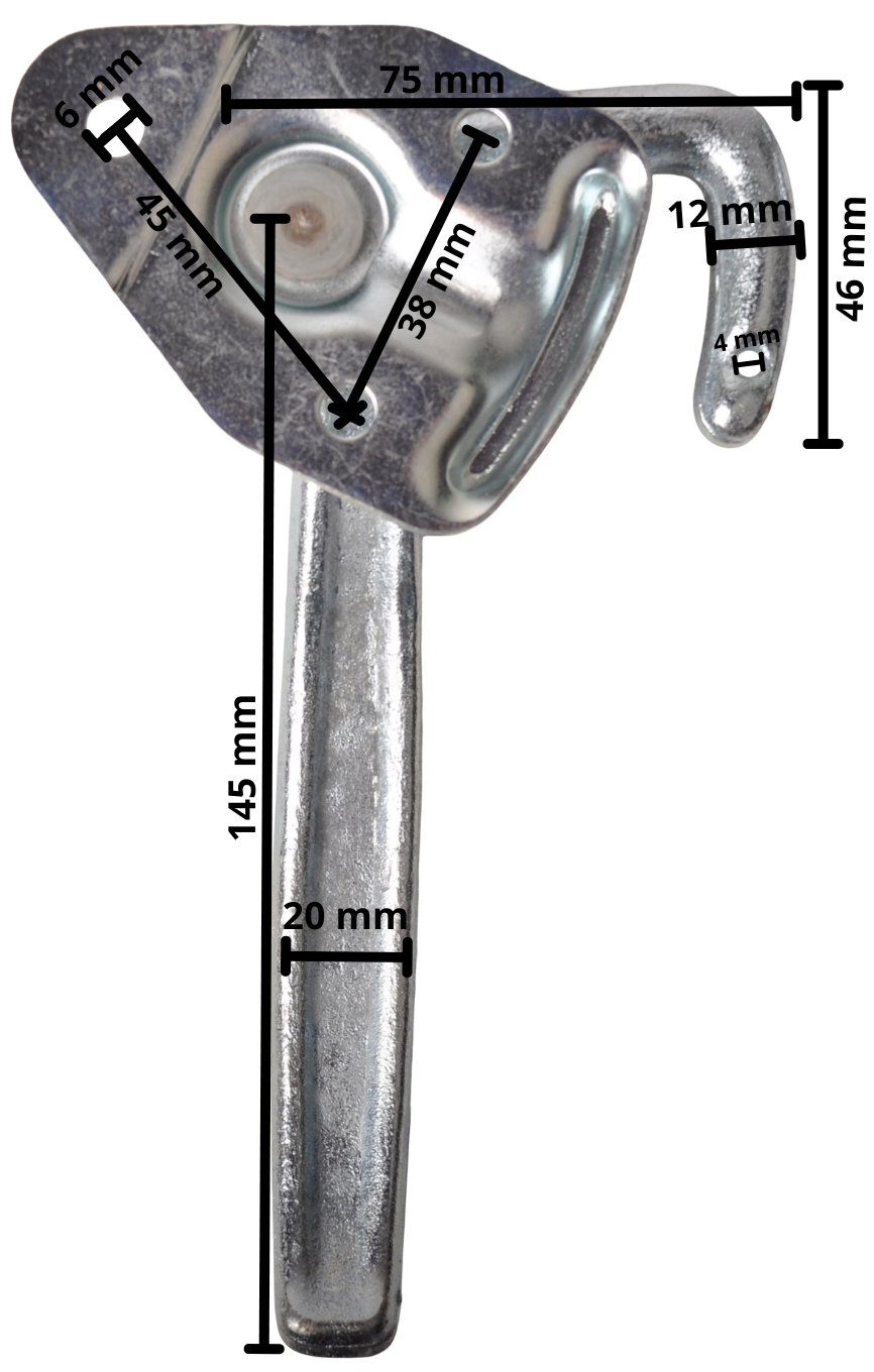 PREMIUM haaksluiting RECHTS type 0 met grote bevestigingsplaat. Een haaksluiting kan gebruikt worden voor het vergrendelen van de laadklep van een aanhanger. Deze haaksluiting heeft een totale lengte van 155 mm.