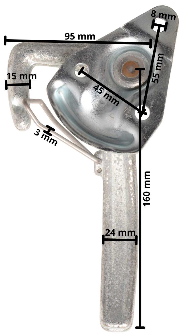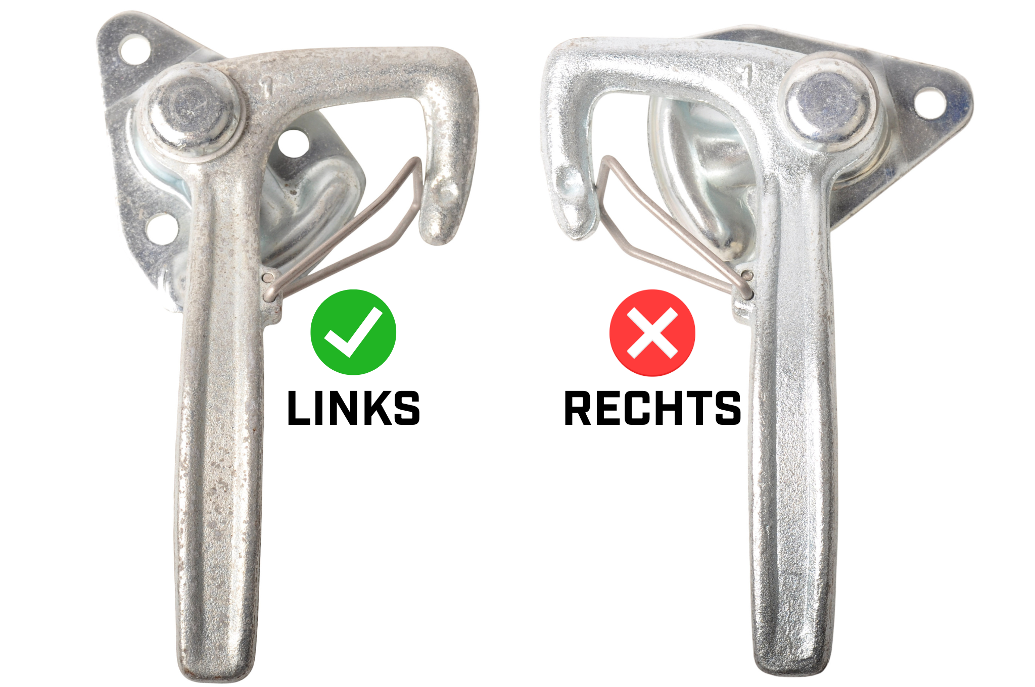 Haaksluiting type 1 links met veer en een grote bevestigingsplaat. Robuuste haaksluiting rechts met veer en handvat /haak.