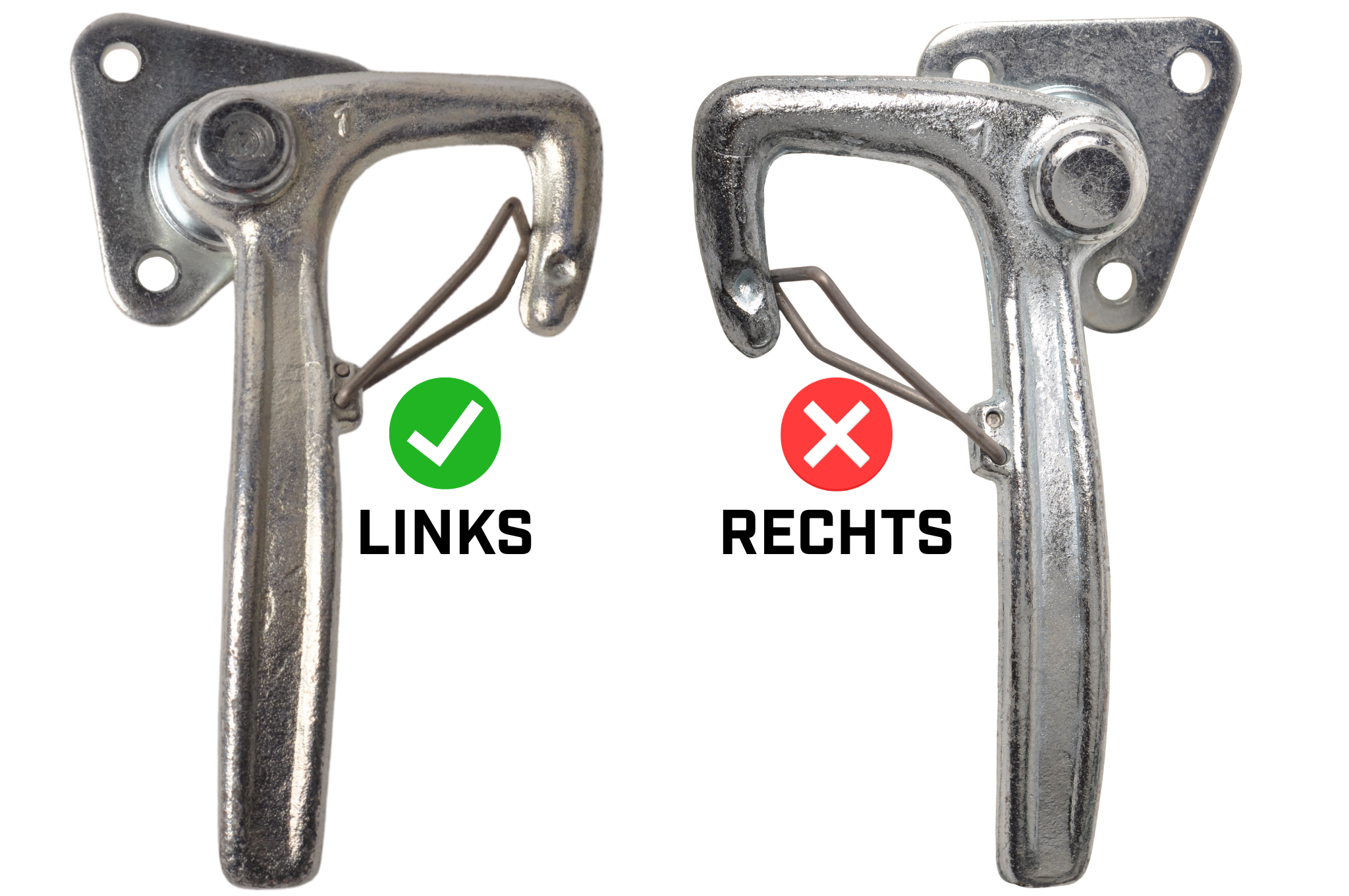 Haaksluiting type 1 links met veer en een kleine bevestigingsplaat. Robuuste haaksluiting rechts met veer en handvat /haak.