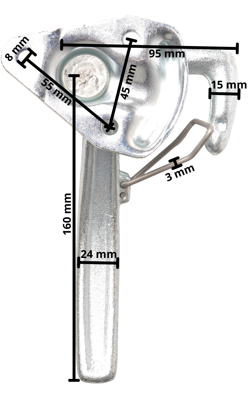 Haaksluiting type 1 rechts met veer en een grote bevestigingsplaat. Robuuste haaksluiting rechts met veer en handvat /haak.