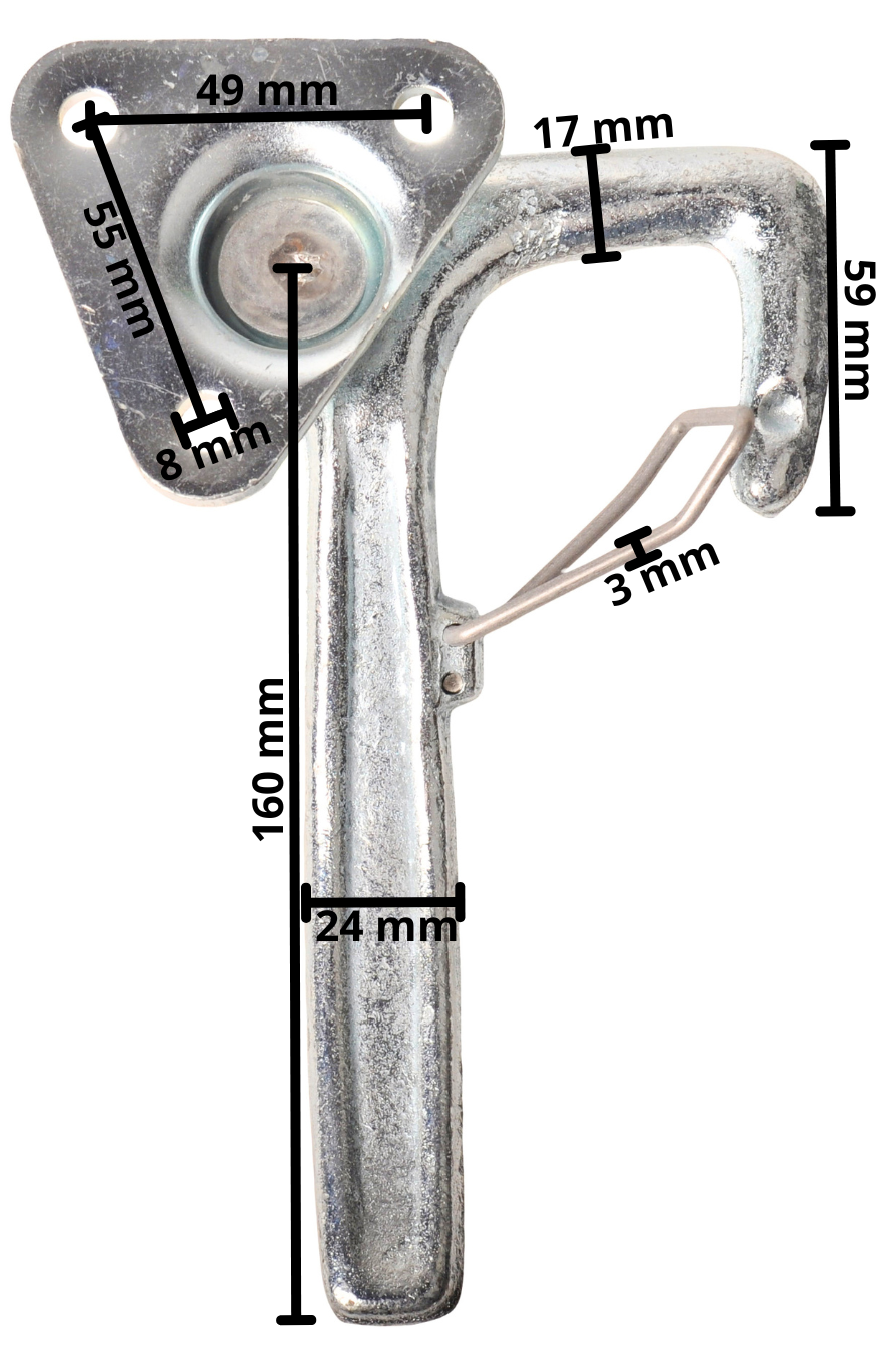 Haaksluiting type 1 rechts met veer en een kleine bevestigingsplaat. Robuuste haaksluiting rechts met veer en handvat /haak.