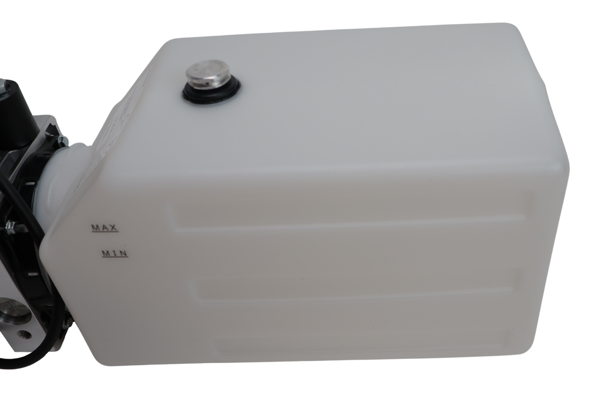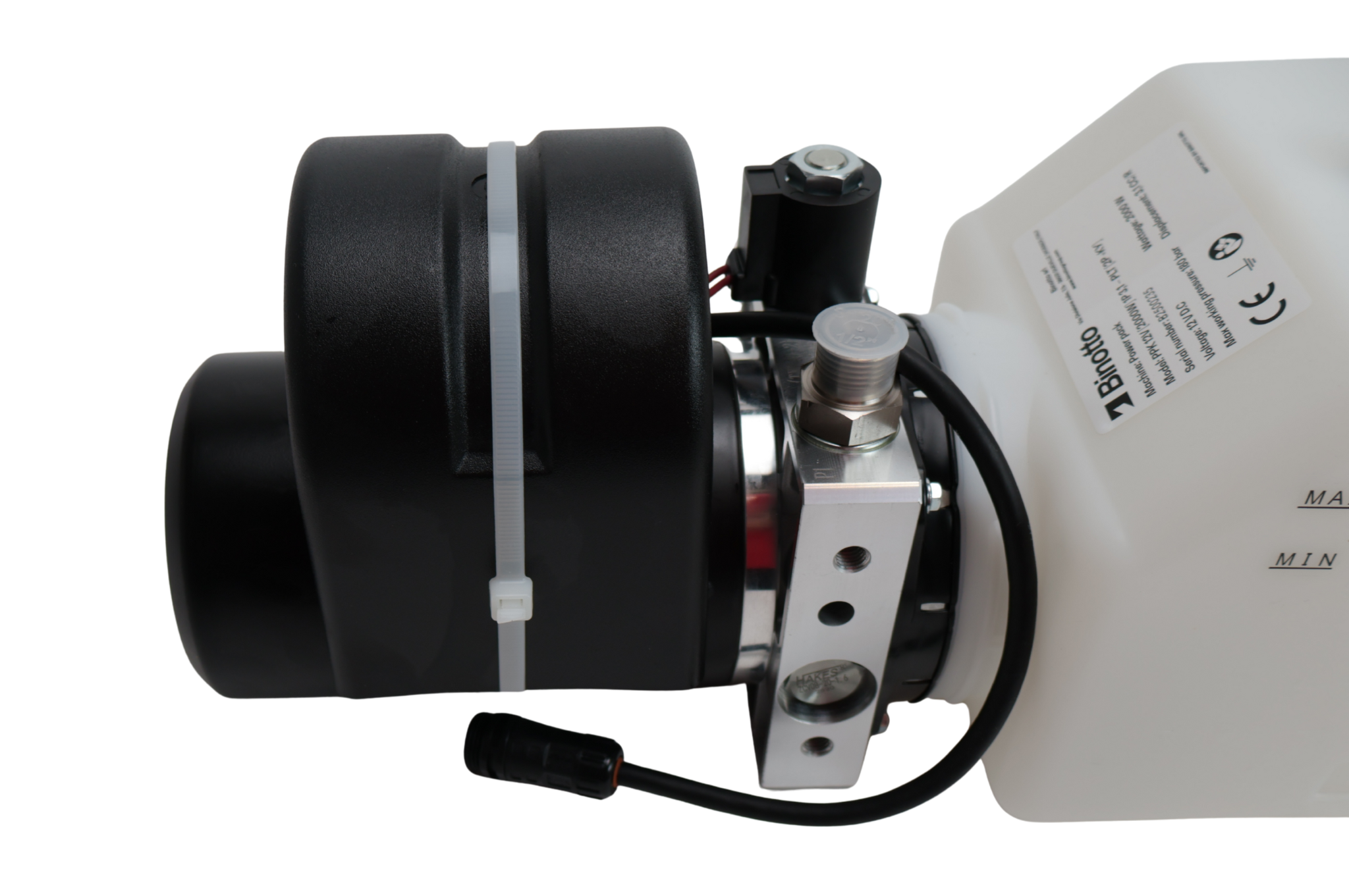 De pomp is uitgerust met een retourpoort voor aansluiting van een noodhandpomp, waarmee de cilinder handmatig kan worden teruggebracht (gelost) bij spanningsuitval of storing. Zo blijft het systeem veilig en bruikbaar, zelfs wanneer de elektrische voeding tijdelijk uitvalt.