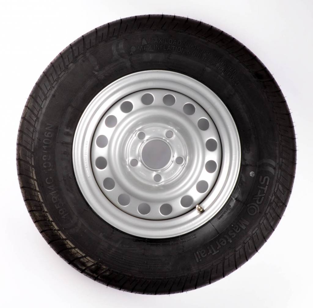 Technische gegevens: Compleet aanhanger wiel - 195/80R14C - steekmaat: 5x112 - draagvermogen: 950 kg - naafdiameter: 67 mm