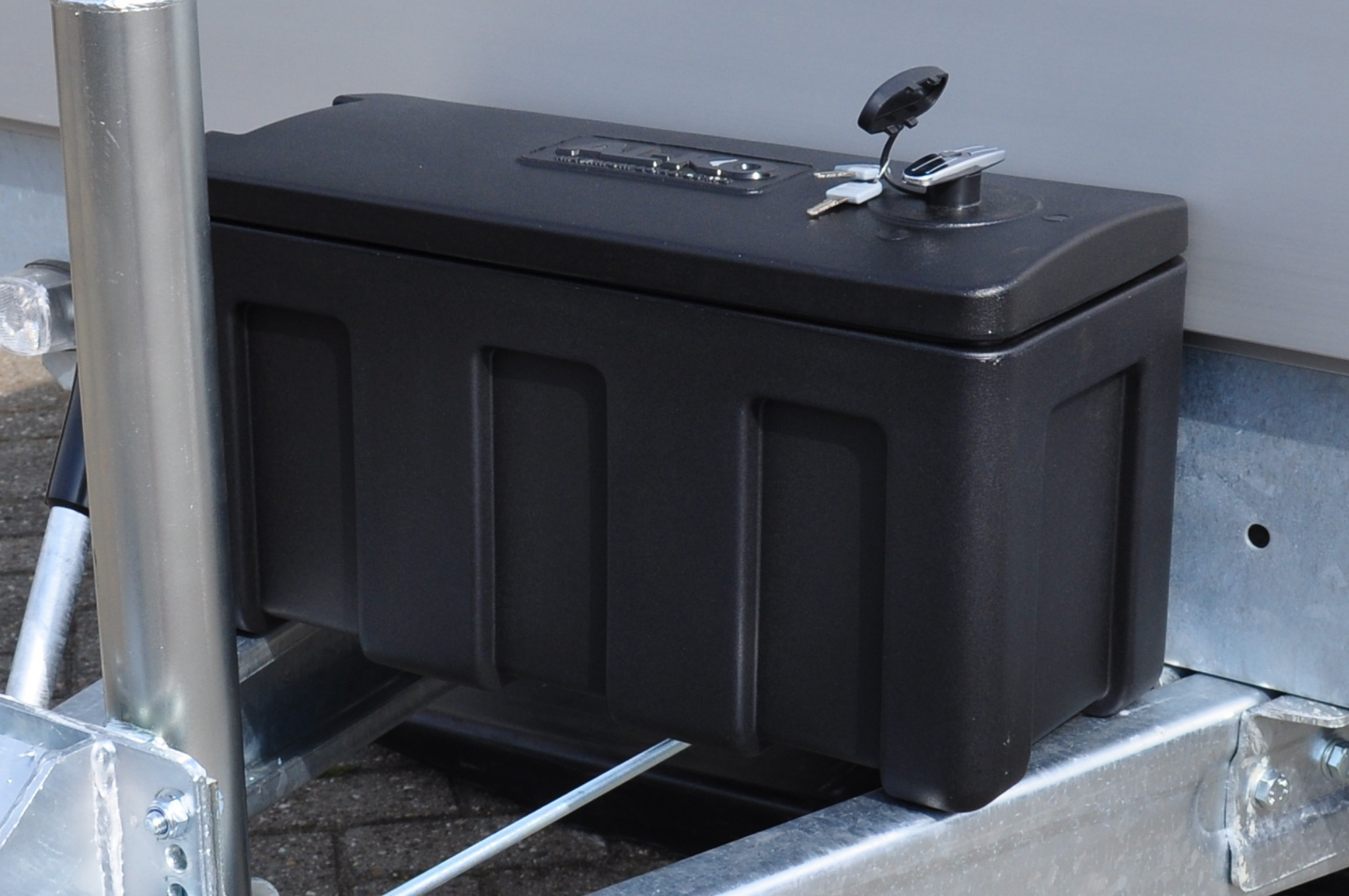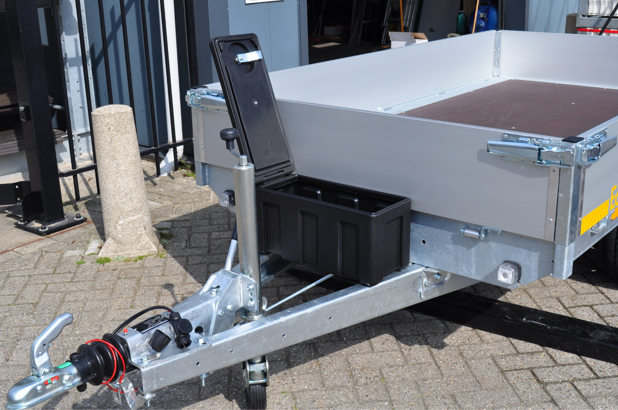 Handige en veelzijdige disselbak voor de aanhangerdissel. Deze kist heeft een speciale deksel die naar de zijkant open gaat. Hierdoor kan je de deksel gemakkelijk helemaal open doen zonder dat deze tegen het voorbord van je aanhanger aan komt.