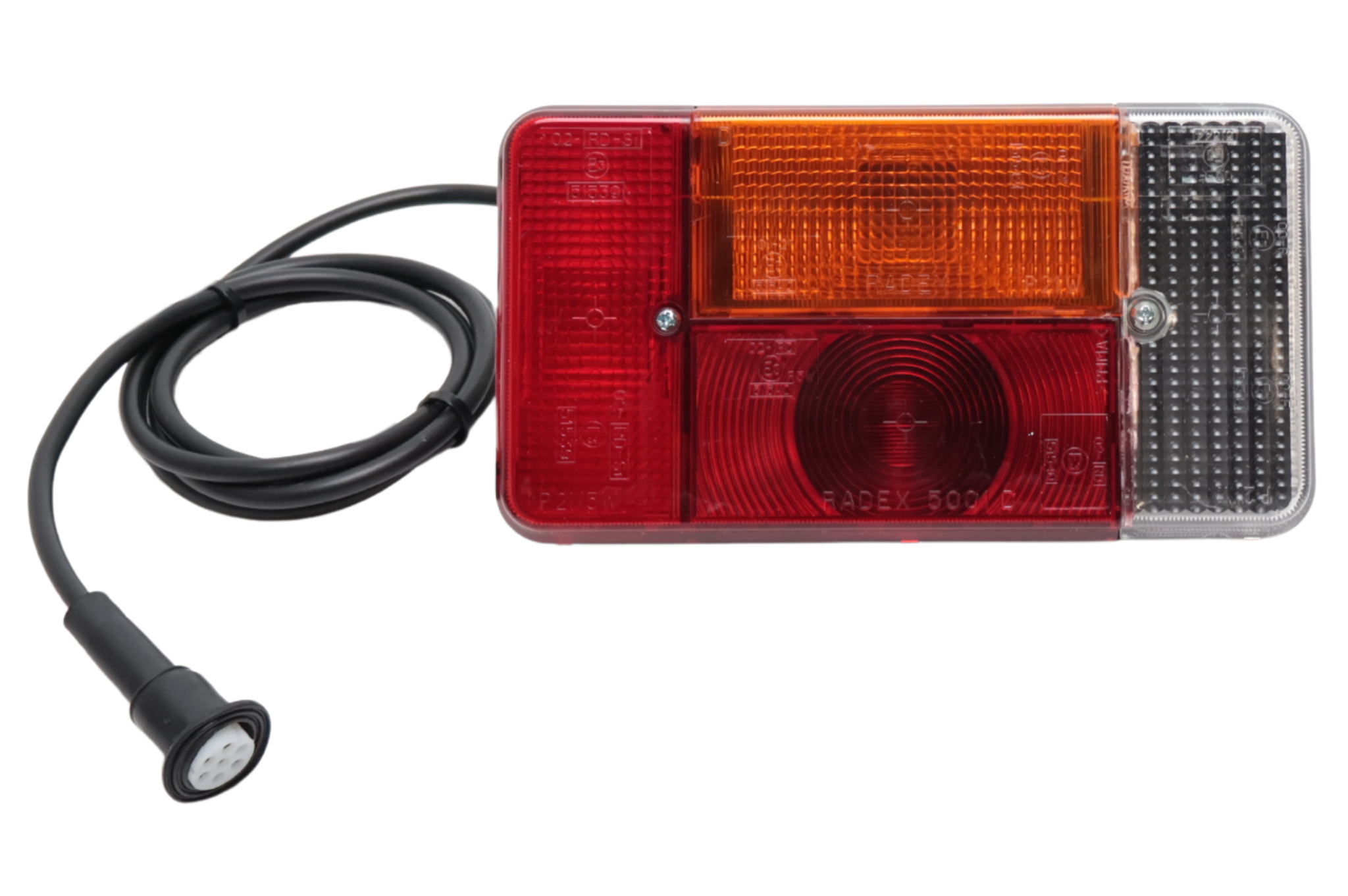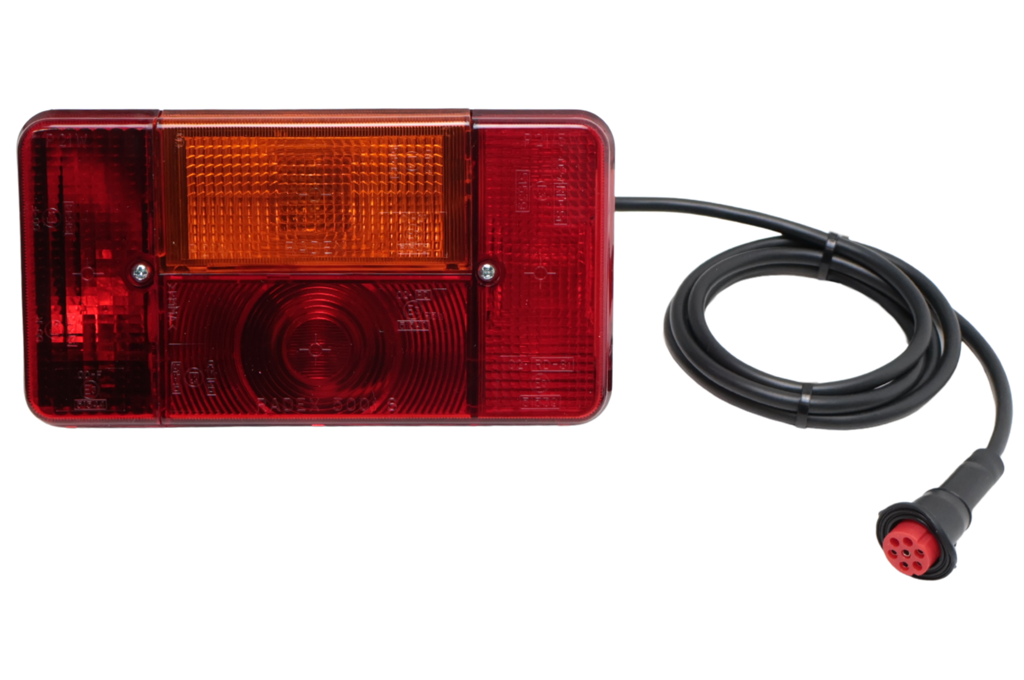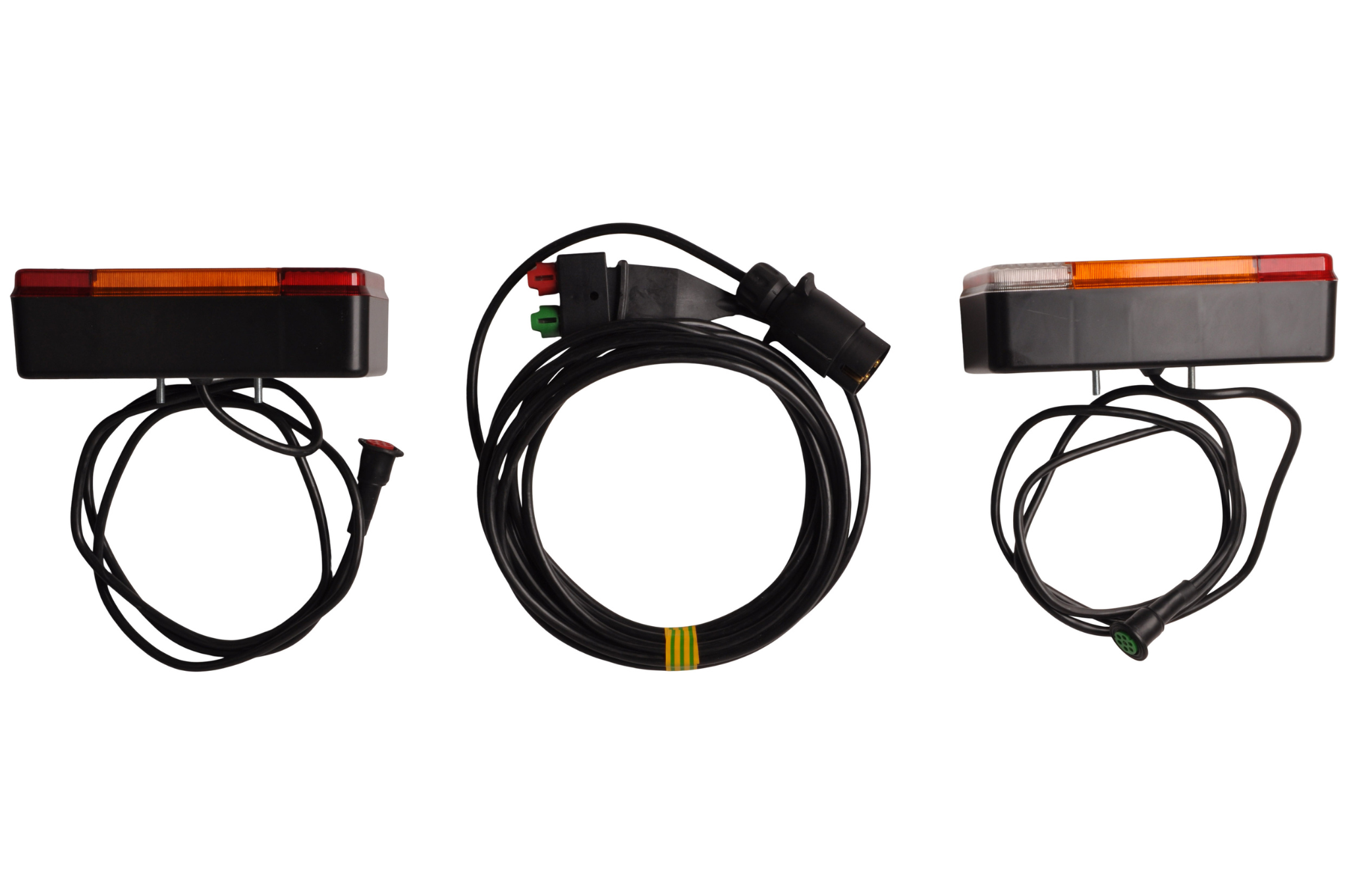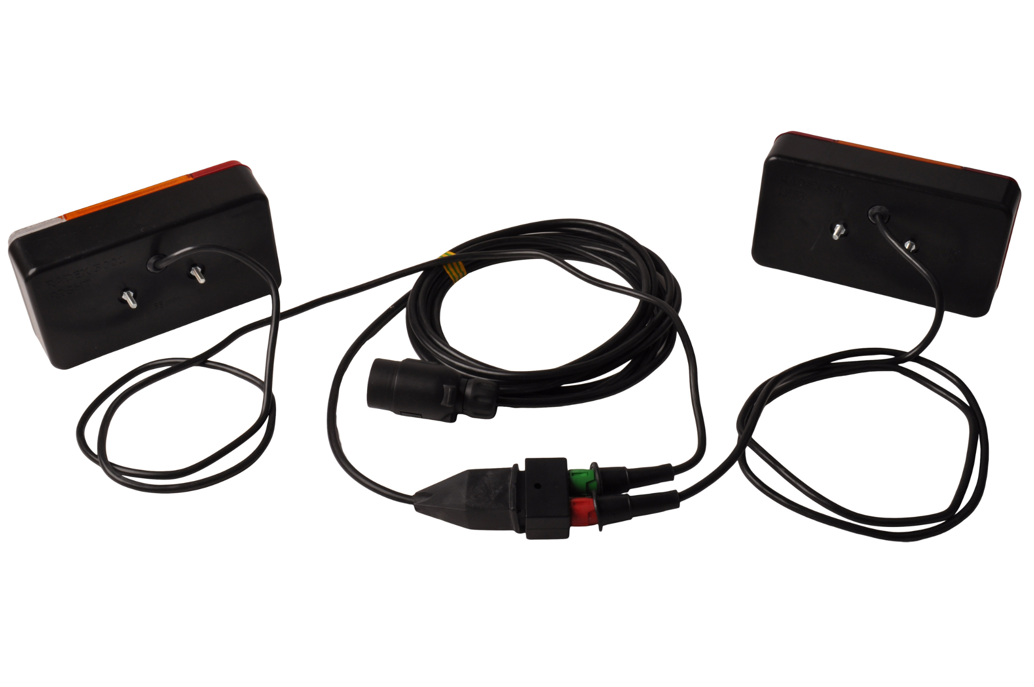 Complete verlichtingsset met RADEX lampen met de afmetingen 194x104x60 mm aangesloten op een kabel met connectoren op 100 cm afstand. Deze kan je vervolgens weer in de 5 meter hoofdkabel prikken en deze naar de dissel begeleiden. Eenvoudig aan te sluiten door Plug&Play connectoren. Om de connectoren op de achterlicht units aan te sluiten is een gat nodig van 30 mm.