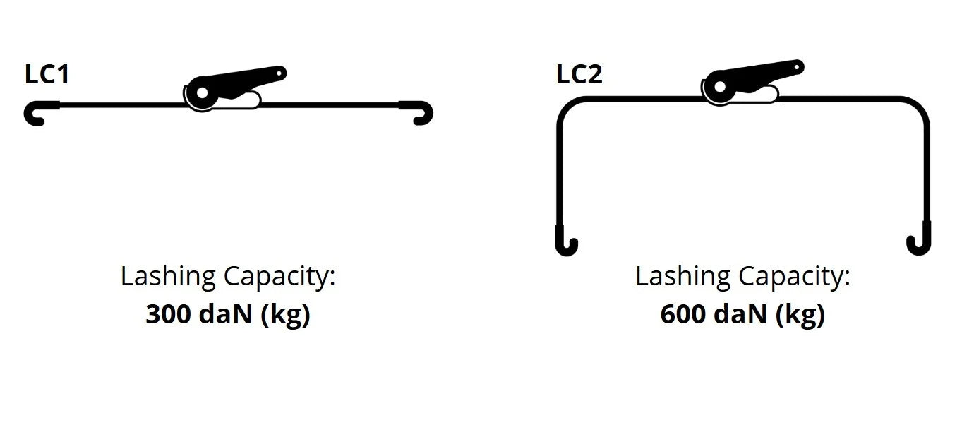 LC1 is de breekbelasting bij direct sjorren, waarbij de lading wordt vastgezet zonder tegen de laadvloer te drukken. LC2 is de breekbelasting bij omsnoeren, waarbij de lading wel tegen de laadvloer wordt gedrukt voor extra stabiliteit.
