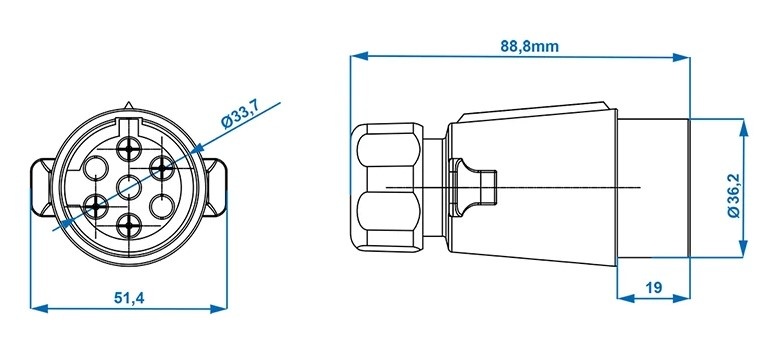 7 po0lige vlakstekker gemaakt van kunststof materiaal. De inwendige kabels zijn aan te sluiten middels kabelschoentjes (Amp stekker).