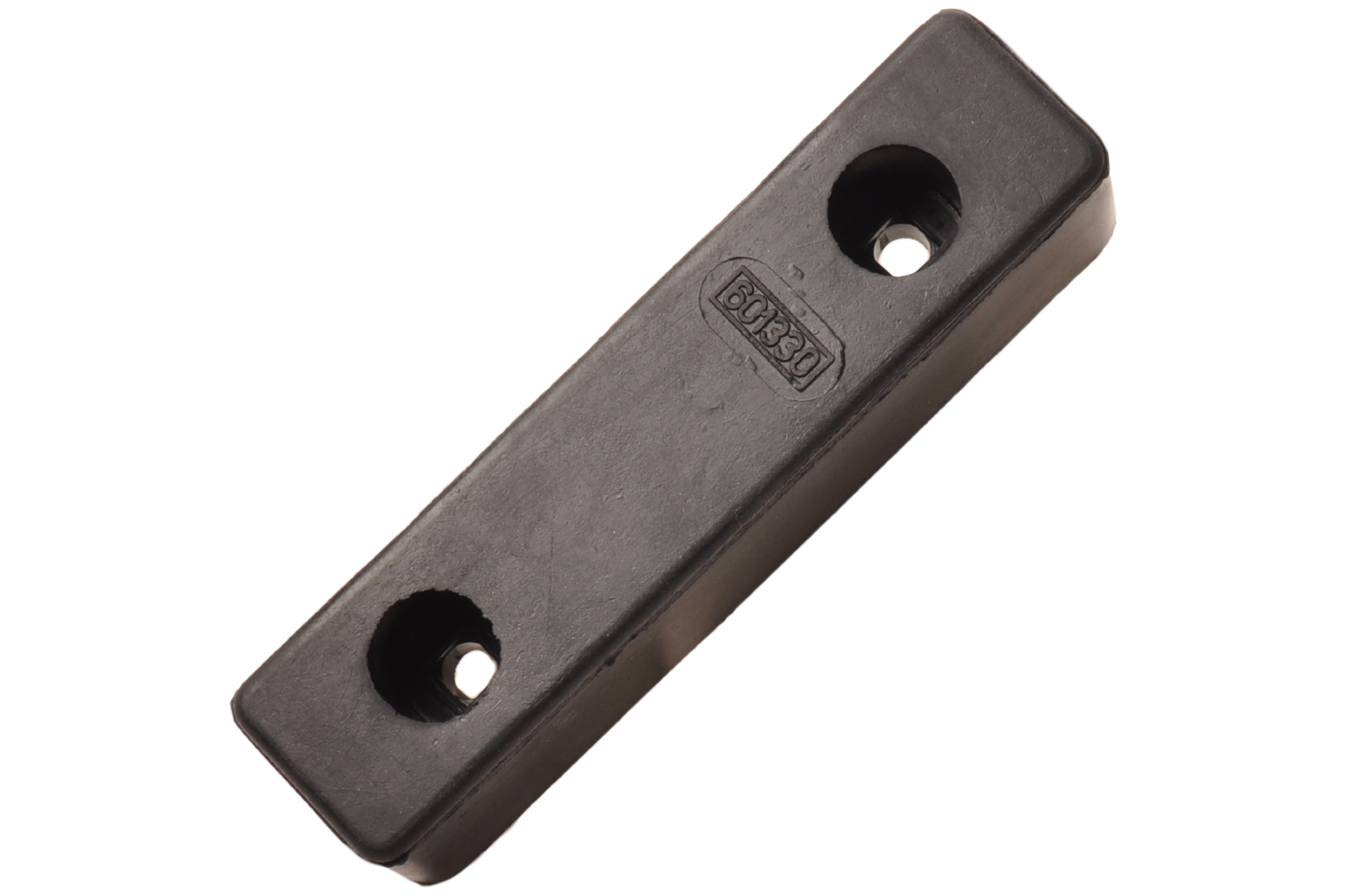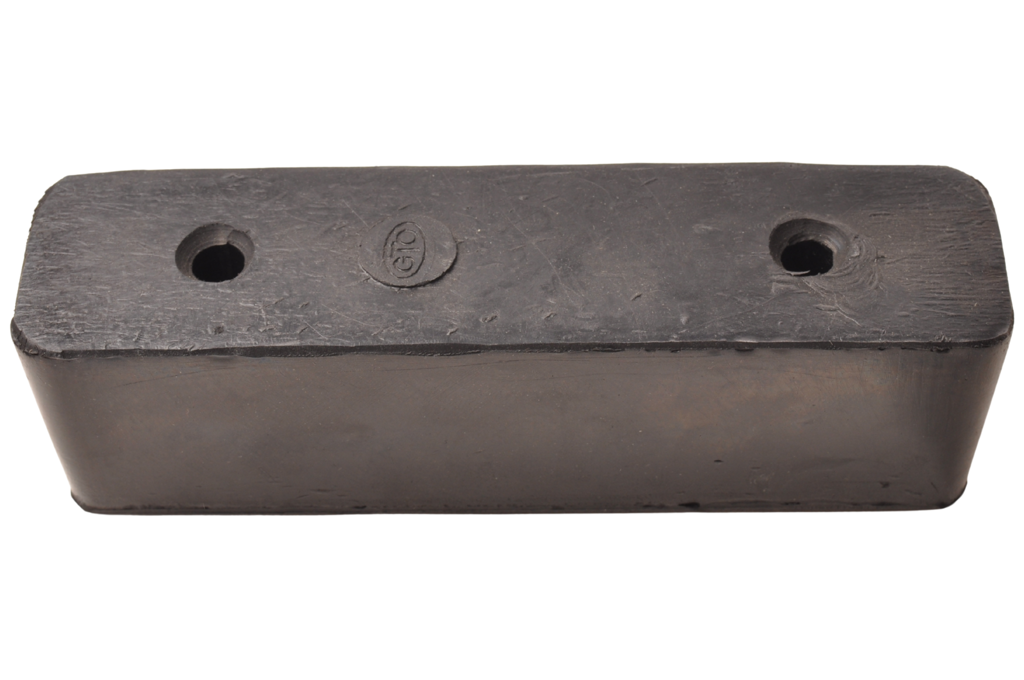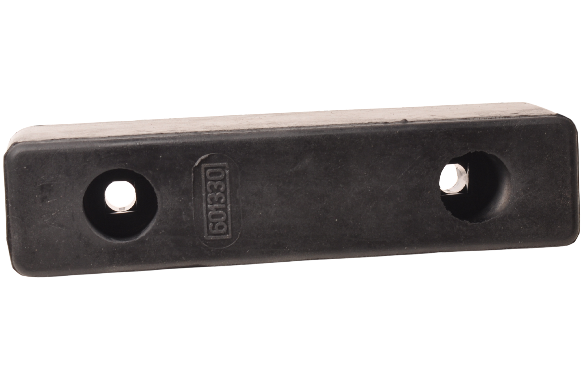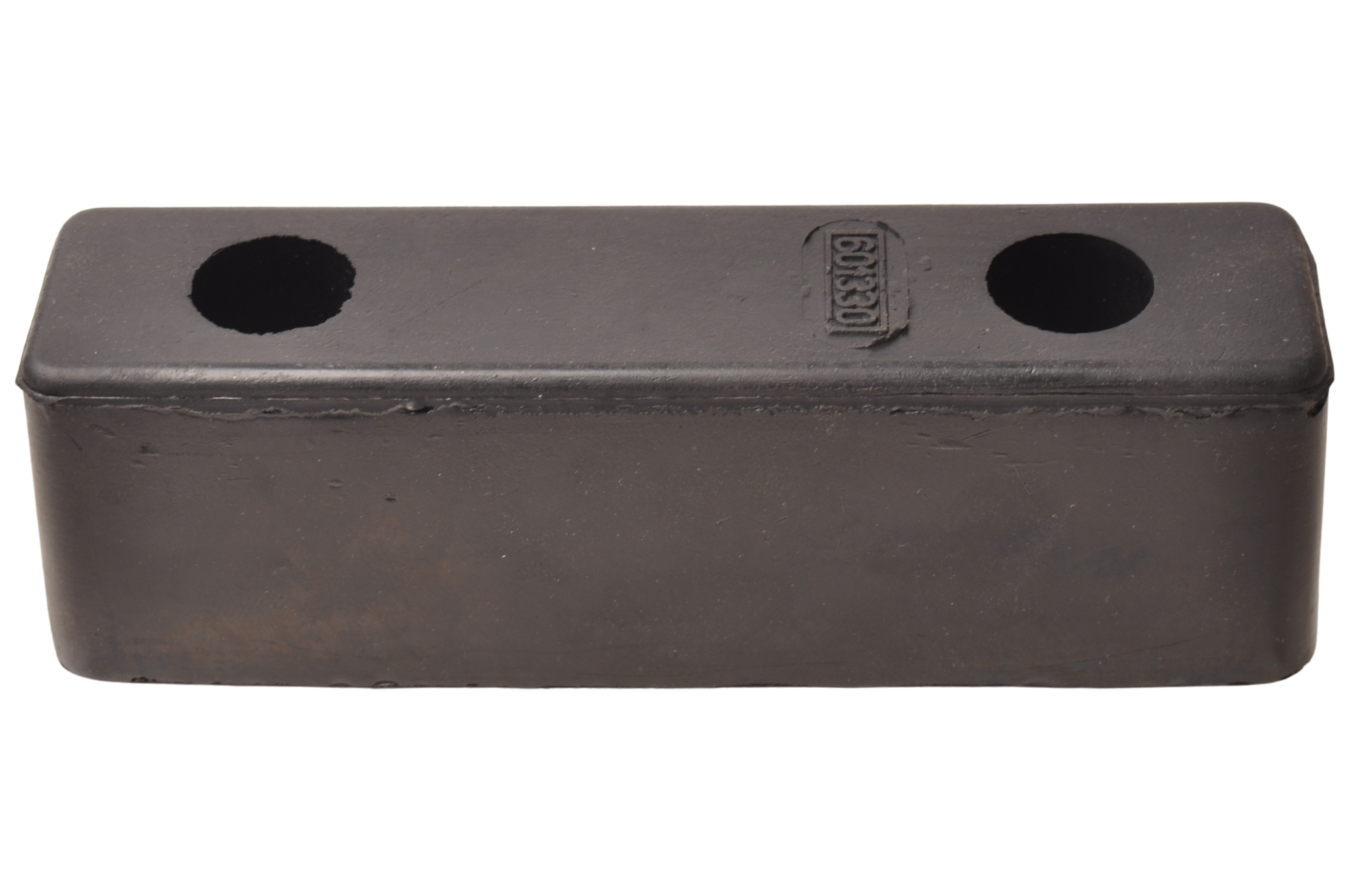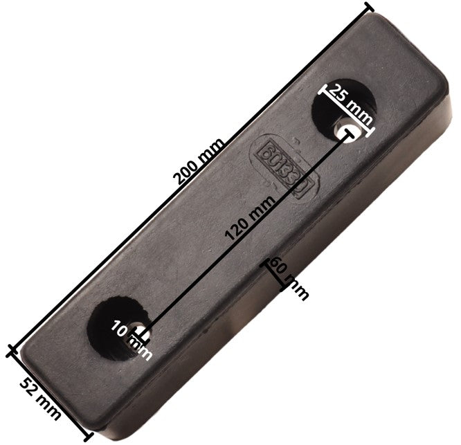 Rubberen stootblok voor boottrailer. Dit zwarte stootblok met de afmetingen 200x52x60 mm is eenvoudig te monteren met de twee bevestigingsgaten in combinatie met slotbouten.
