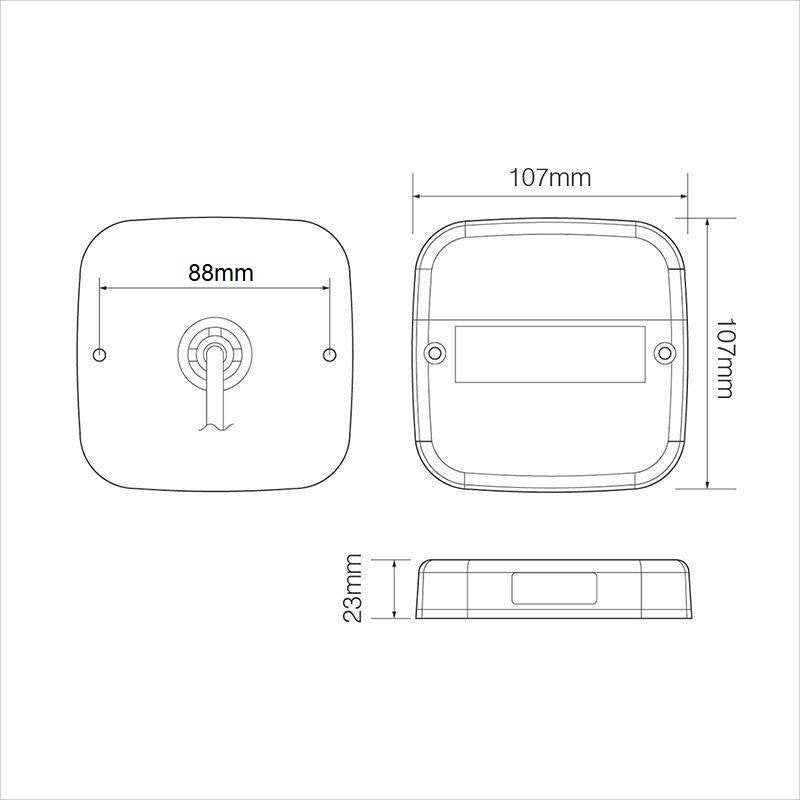 Deze LED lamp heeft de afmetingen van 107x107x23 mm maar heeft maar liefst vijf functies. Deze kabel beschikt over 30 cm losse draad waarmee je deze lamp kan aansluiten op de hoofdkabel. Zowel links als rechts toepasbaar.