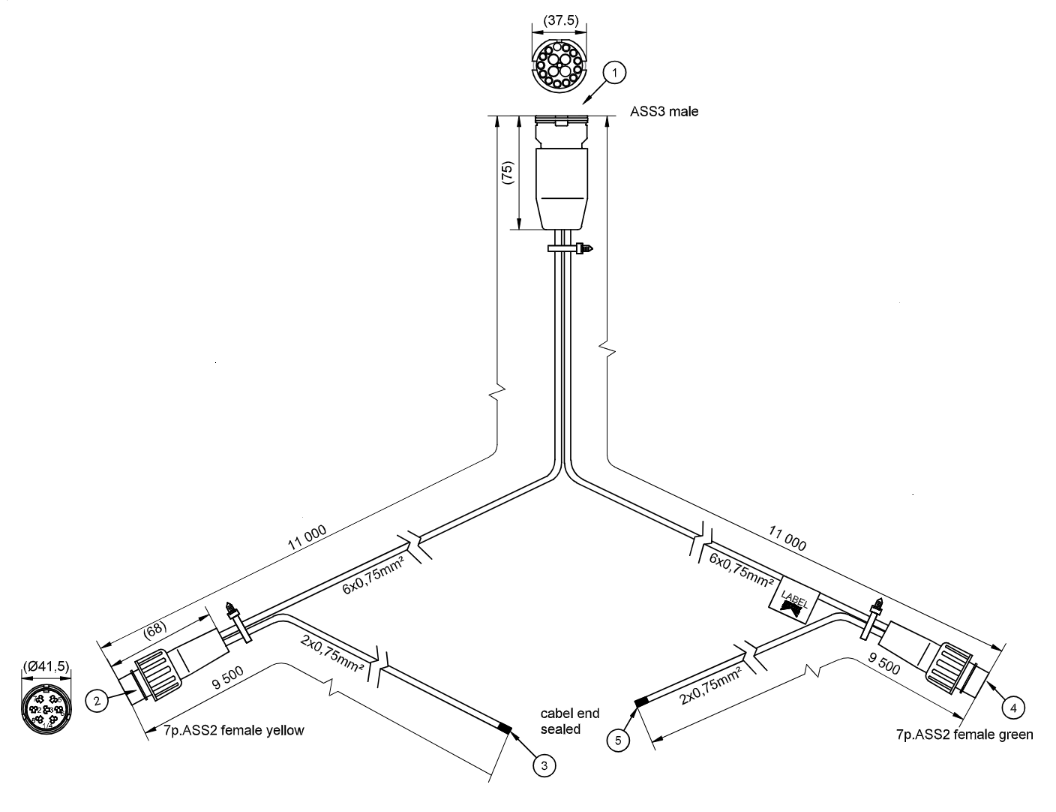 Technische gegevens: Aspöck hoofdkabel - 13 polig - 11 meter - waterdicht - 2x 7 polige ASS2 connector - Plug & Play - aftakkingen 950 cm